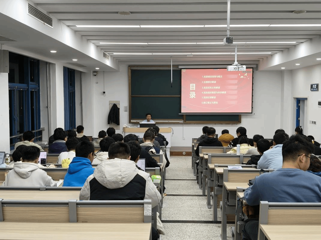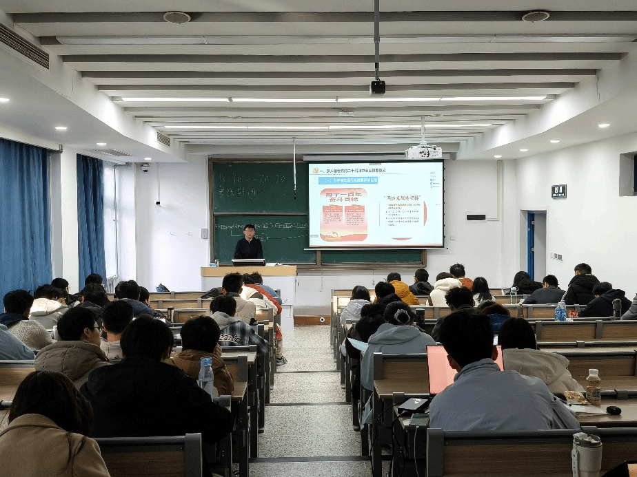 11月30日,李鹏副教授以“在接续奋斗中谱写中国式现代化新篇章——深入学习贯彻党的二十届四中全会精神”为题,聚焦“党的四中全会”对于推进国家治理体系和治理能力现代化的部署与要求。他强调新时代青年要把个人成长融入国家发展大局,在学思践悟中提升服务社会的能力,努力成为担负民族复兴使命的生力军。
