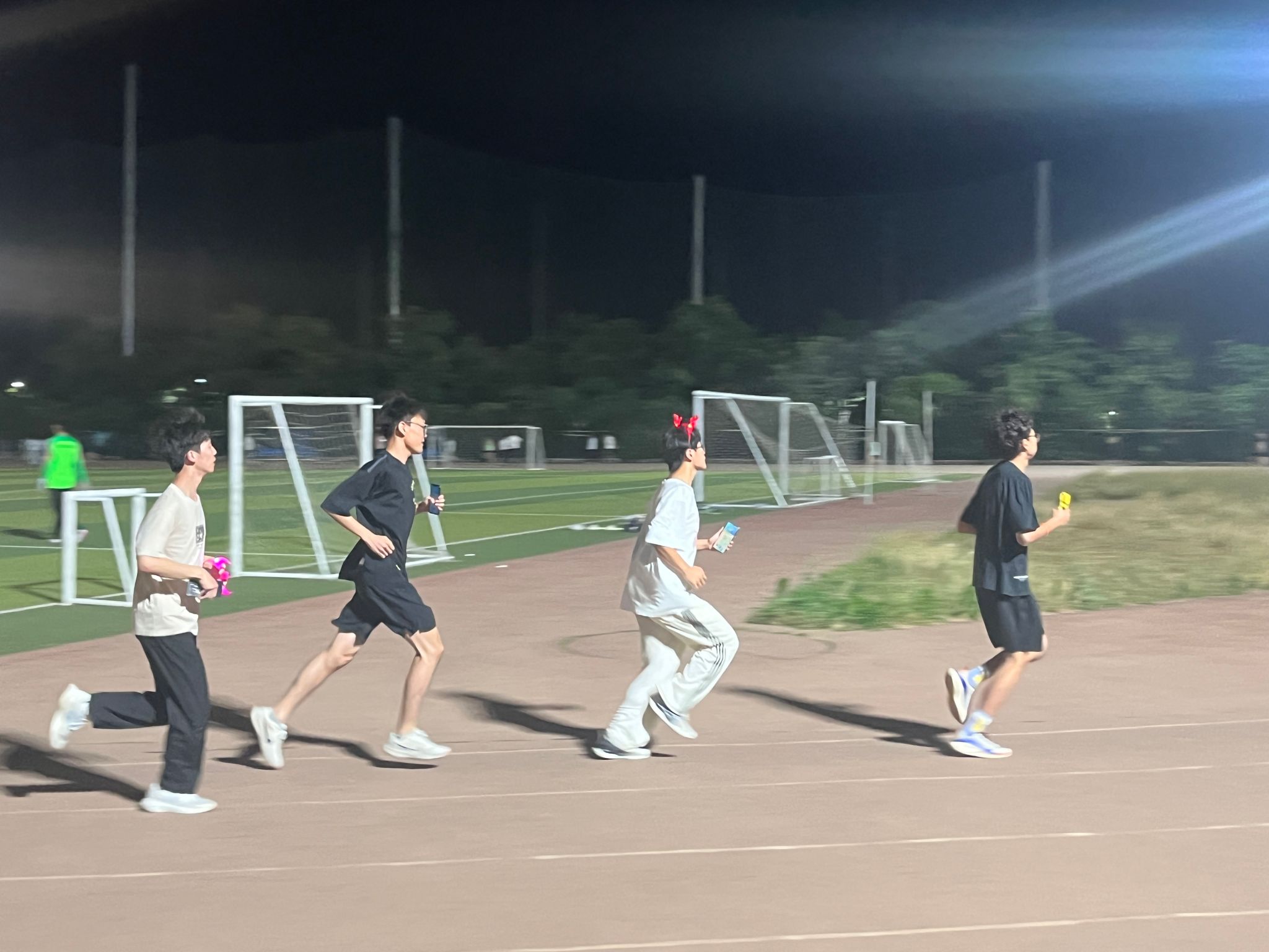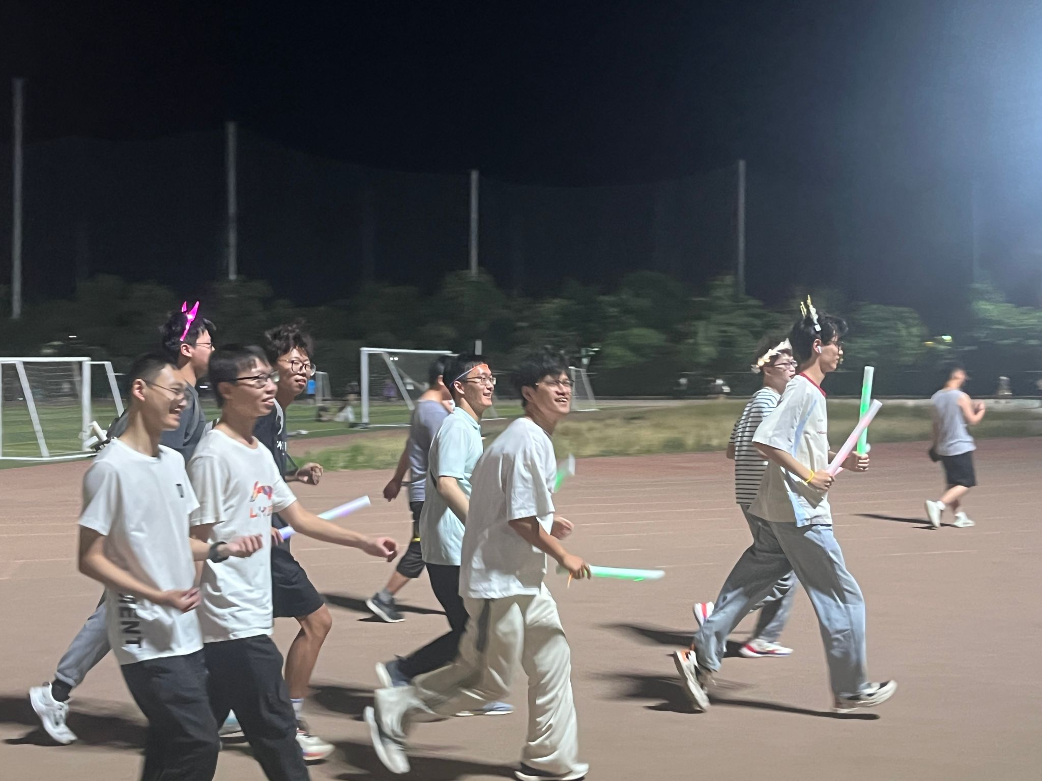 晚上八点,参与活动的同学们陆续来到操场外场,领取荧光手环、贴纸,荧光染料等装备。随着夜幕降临,佩戴荧光饰品的跑者成为操场上一道流动的风景线。有人挑战自我,在15分钟内完成3.2km的距离;有人结伴慢跑,享受晚风与友伴的欢笑;更有“萌新”跑者首次尝试夜跑,在志愿者的鼓励下融入其中。