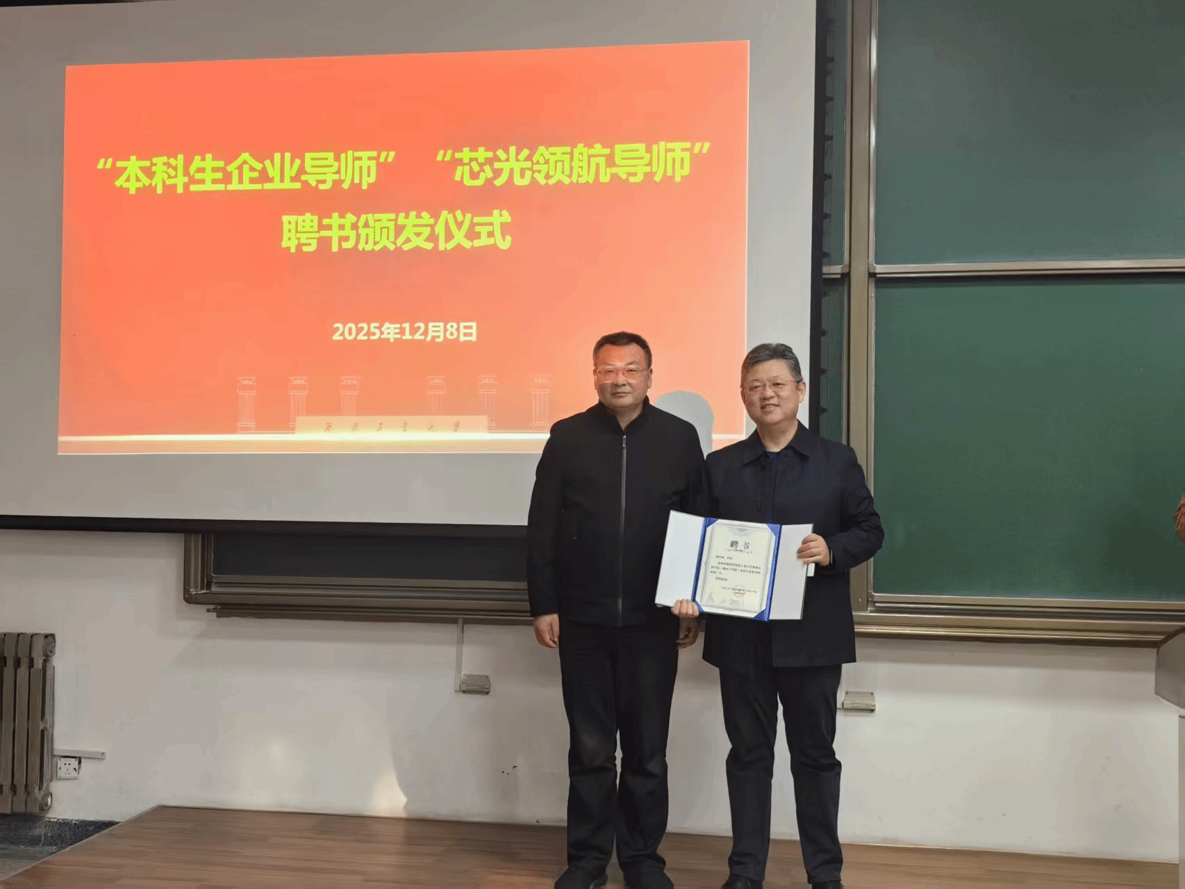 讲座伊始,马炳和向魏育成颁发“芯光领航导师”与“本科生企业导师”聘书,旨在夯实学生思政教育,引导学生立大志向、上大舞台、入主战场、干大事业,同时聚焦课程教学、实习实践、项目指导与学生职业发展,推动产业经验深度融入人才培养全过程,强化学生工程创新能力与行业适应力。进一步深化校企协同育人,充分发挥企业专家在人才培养中的指导作用。